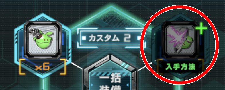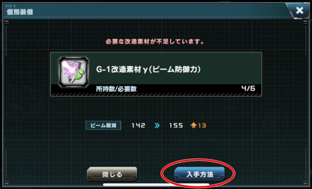 モビルスーツの強化画面で必要アイテムが揃っていないものは「入手方法」と表示されますので「入手方法」を選択します。