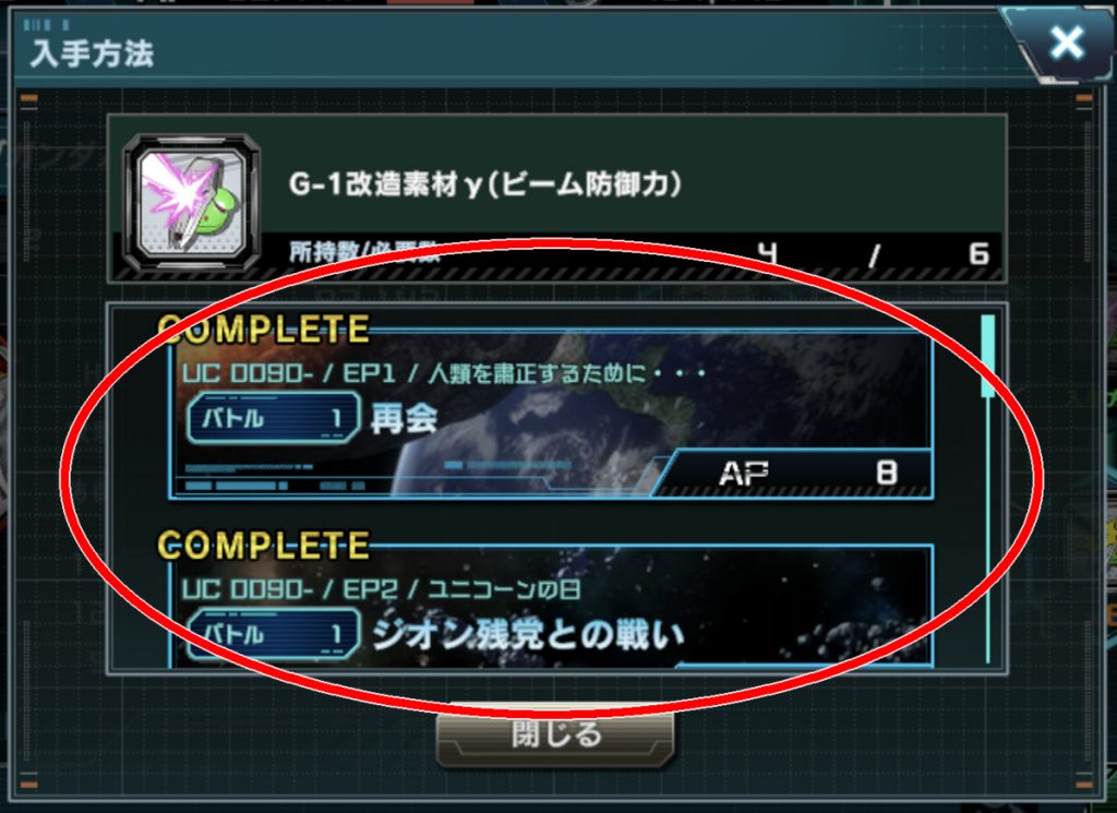 強化素材(モビルスーツのレベルアップ用)の集め方はこちら