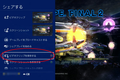SHAREボタンを1回押すとで左側にメニューが表示され、□ボタンで動画として保存しておくことができます。